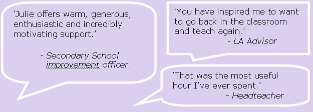 We have worked with local authorities, head-teachers, senior leadership teams and subject departments/key stage teams as consultants at primary and secondary level, and have consistently found this form of support, tailored as it is to the needs and agenda of the individual or group, to be the most effective and helpful method of support.